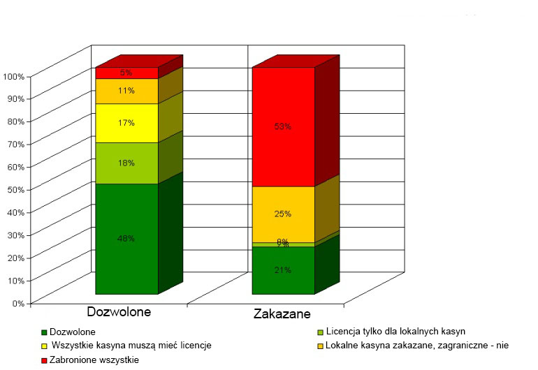 Pozostało 151 krajów (67% badanych), w których dozwolone są zakłady hazardowe na ziemi. Dlatego tylko 47% światowej populacji może swobodnie odwiedzać kasyna w swoich krajach.