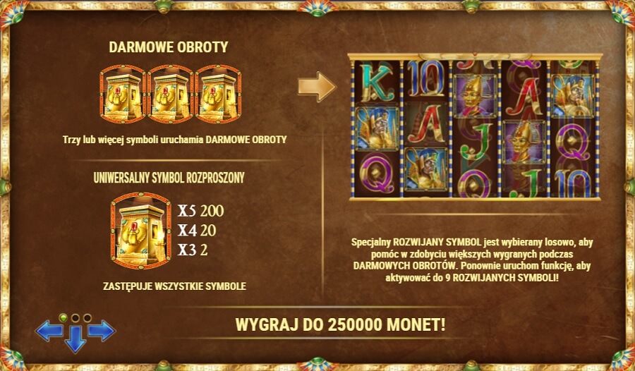 Złoty symbol świątyni to Scatter oraz Wild. Oznacza to, że tworzy on kombinacje bez względu na położenie na bębnach. Wystarczy, że w dowolnym miejscu na ekranie pojawią się przynajmniej 3 ikony i można liczyć na wygraną pieniężną oraz uruchomienie rundy darmowych spinów.